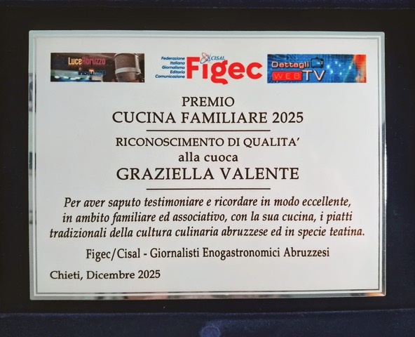 PESCARA - Si è tenuta ieri sera, presso la sede del NOT (Nucleo Operativo Teatino) di Protezione Civile in via dei Frentani 393 la cerimonia di premiazione della cuoca Graziella Valente, con il Premio “Cucina Familiare 2025”, assegnato dai giornalisti enogastronomici abruzzesi Figec/Cisal.