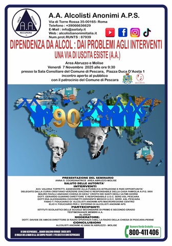 PESCARA - Si svolgerà venerdì 7 novembre, dalle 9.30 nella sala consiliare del Comune di Pescara, il seminario dal tema “Dipendenza da alcol: dai problemi agli interventi. Una via d’uscita esiste: Alcolisti anonimi”. Sarà questo un incontro aperto al pubblico organizzato dall’Area Abruzzo-Molise degli Alcolisti anonimi, con il patrocinio del Comune di Pescara, in occasione dei 90 anni della fondazione della nota associazione (avvenuta negli Stati Uniti nel 1935), attiva a Pescara dal 1983 e oper...