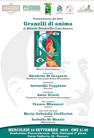 PESCARA - Sarà presentato mercoledì 24 settembre, alle ore 17:30, presso la Fondazione Pescarabruzzo il libro “Granelli di anima” di Alessio Scancella, Costa Edizioni. L'evento è stato organizzato dall’Associazione Eremo Dannunziano con i patrocini della Provincia di Pescara, del Comune di Pescara, della Fondazione Pescarabruzzo, della Casa della Poesia.