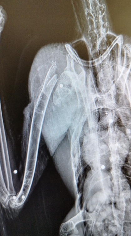 subito una radiografia che ha rilevato la presenza di numerosi pallini da caccia nel corpo del